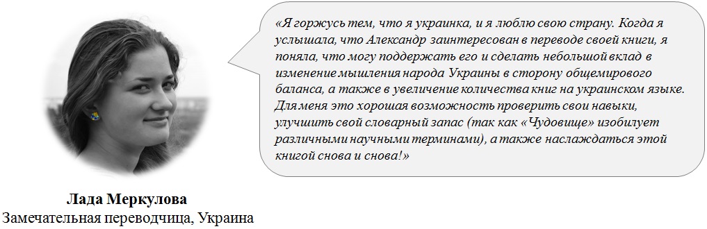 Кроме этого, любители книг в Украине могут ожидать особый подарок в 2015 году в виде романа «Чудовище: Лезвие Тьмы» на украинском языке. Двое моих замечательных друзей, Лада Меркулова и Александра Поливаная, любезно вызвались представить его читателям, говорящим на украинском языке, и уже начали переводить роман. Так его украинская версия дополнит русскую и английскую книги, которые уже поступили в продажу, и она должна стать доступной к концу 2015 года.